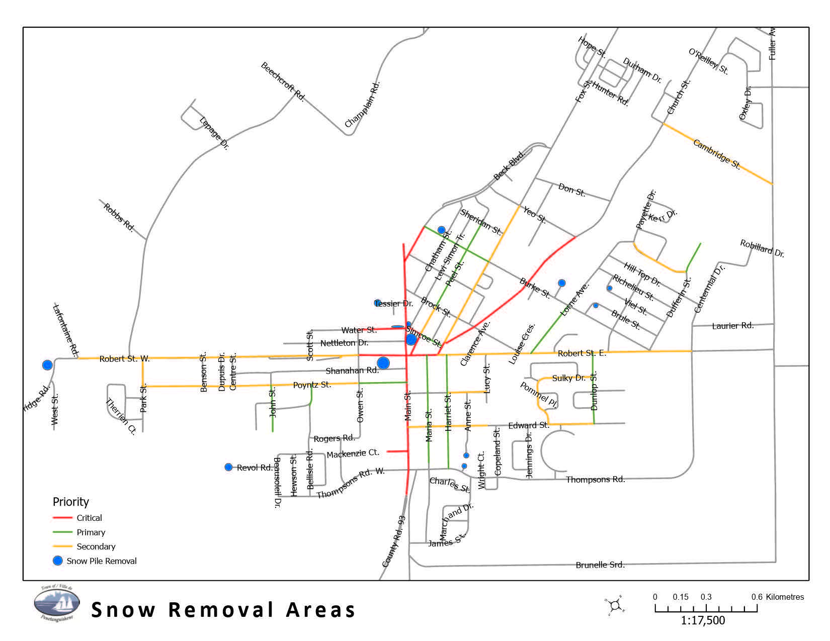 The Town of Penetanguishene would like to advise residents and businesses that the Road Division will continue to perform snow removal in accordance with the Town’s Winter Maintenance Policy. Work has begun in the Secondary Areas (as shown on the map below), during overnight hours from 11:00 p.m. to 7:00 a.m.